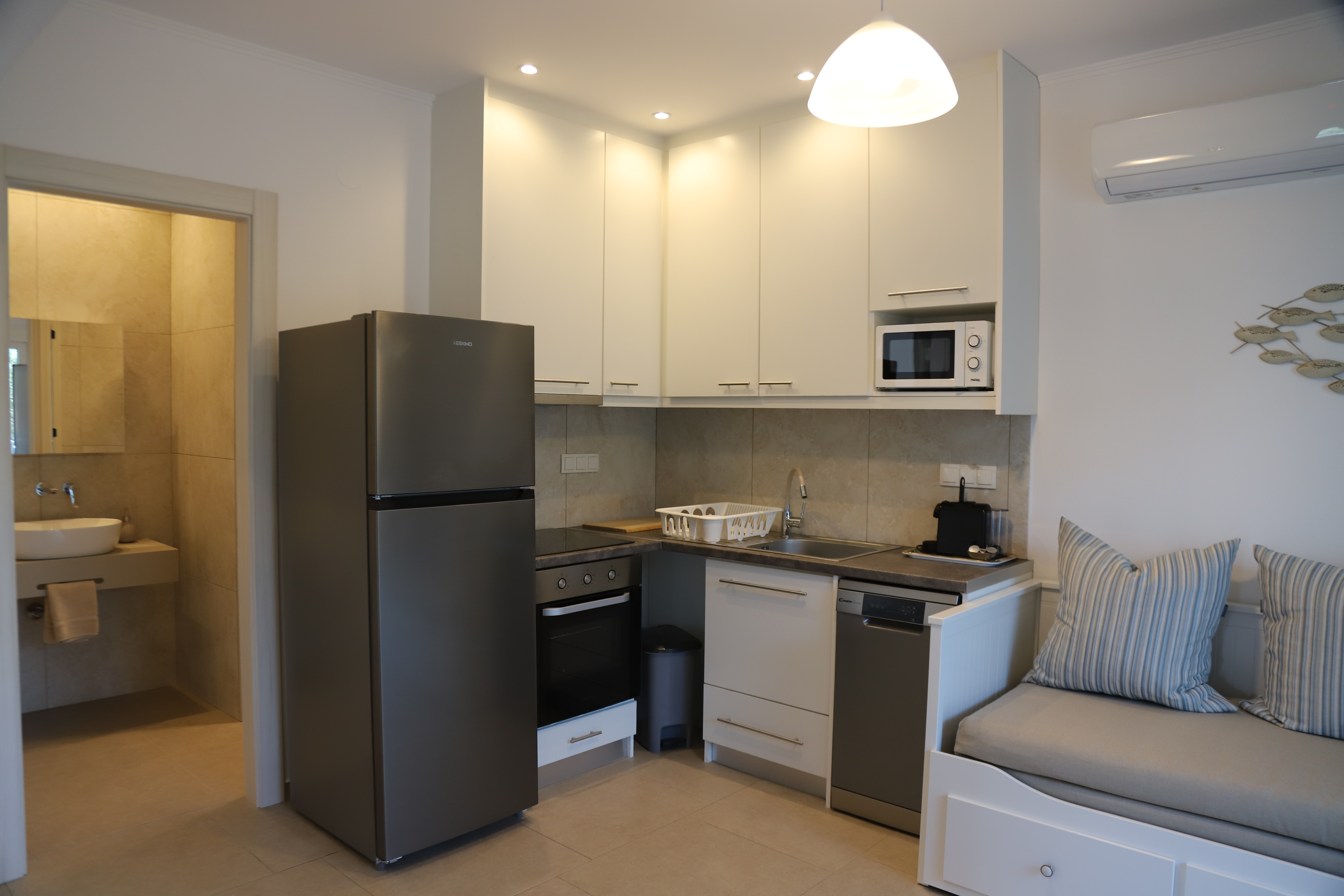 We designed this apartment to meet the needs of larger groups of families and friends, accommodating 5 adults and 2 children.. We put a king-size bed in the master bedroom, a single bed and a double bed in the second bedroom, and added a sofa-bed which pulls out to give 2 single beds for the little ones in the living room. There is a fully fitted kitchen with an oven and hob, and a dishwasher, and the property has washing machines for residents to use.. We've provided two bathrooms with large walk-in showers and ample seating on the 3